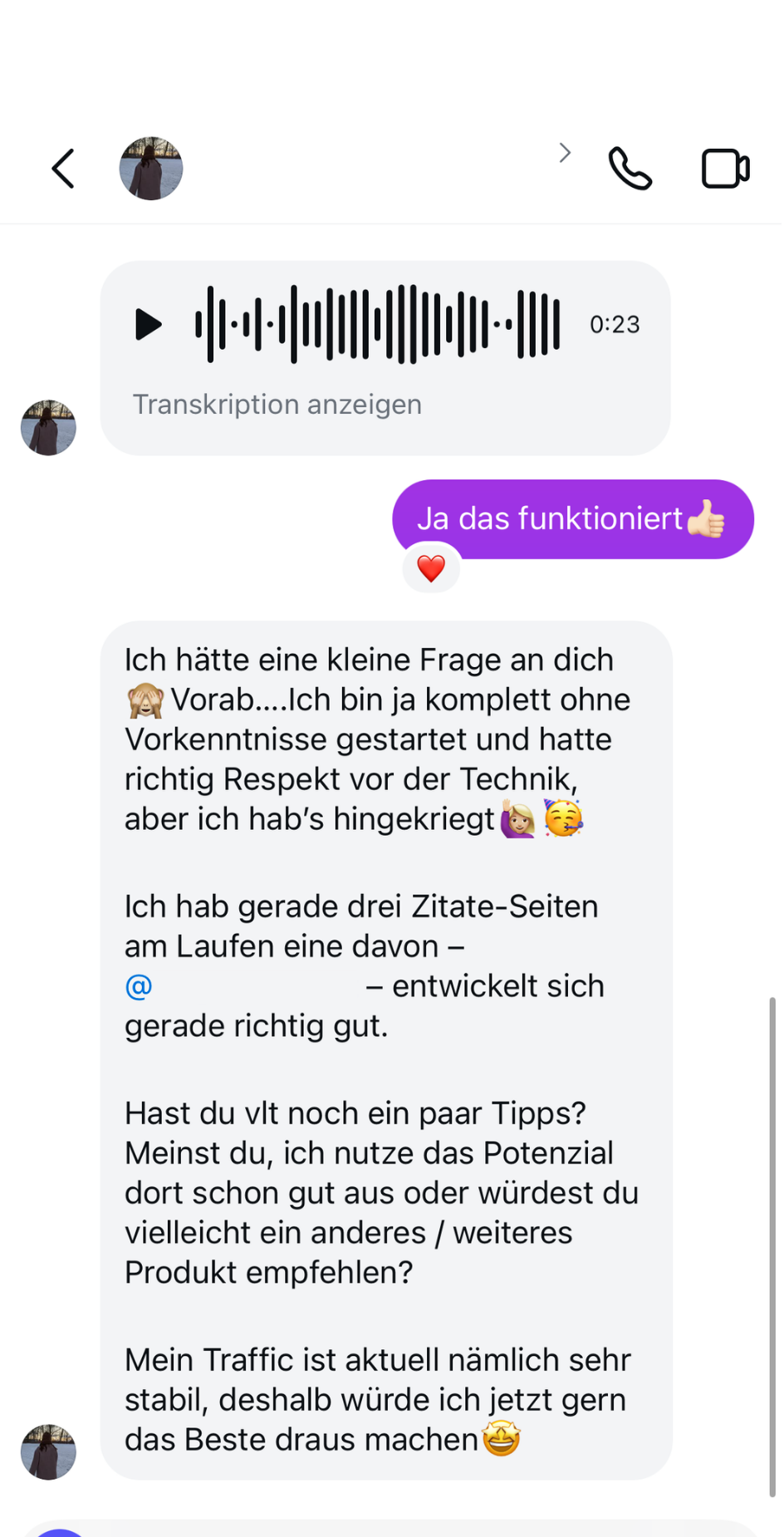 Für jede erfolgreiche Empfehlung erhältst du eine Provision. Inhalte wie Reels oder Slides werden mit Hilfe von KI erstellt. Mobil oder am Desktop umsetzbar. Durch gezielte Stellschrauben in Profil und Content ziehst du systematisch Aufmerksamkeit und Interessenten auf dich - KI gestützte DMs sind der Key. Egal, ob eine Seite mit Memes, Zitaten, Tipps oder Infos, meine Methode passt sich nahezu jeder Seite / jedem Content an. Du duplizierst deine Accounts, die funktionieren, somit steigt dein Verdienstpotenzial.